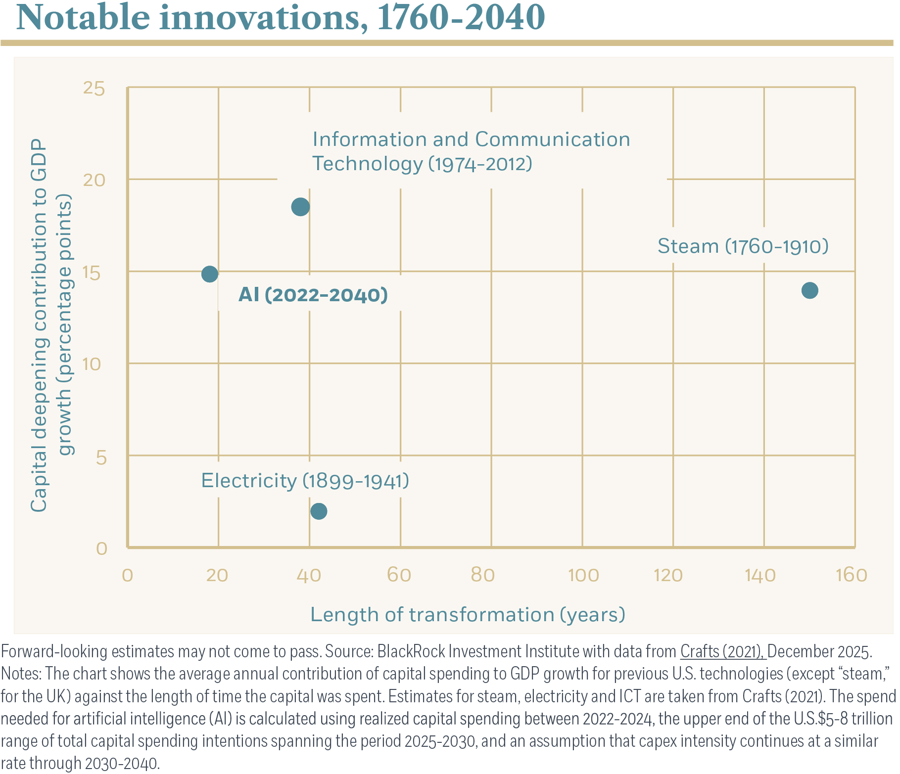 Capital spending for AI (building data centers, power grids, software) is becoming so massive that individual company decisions are now driving the entire macro economy. As the chart below shows, the scale of this investment could rival or exceed past technological revolutions like electricity or the internet.
